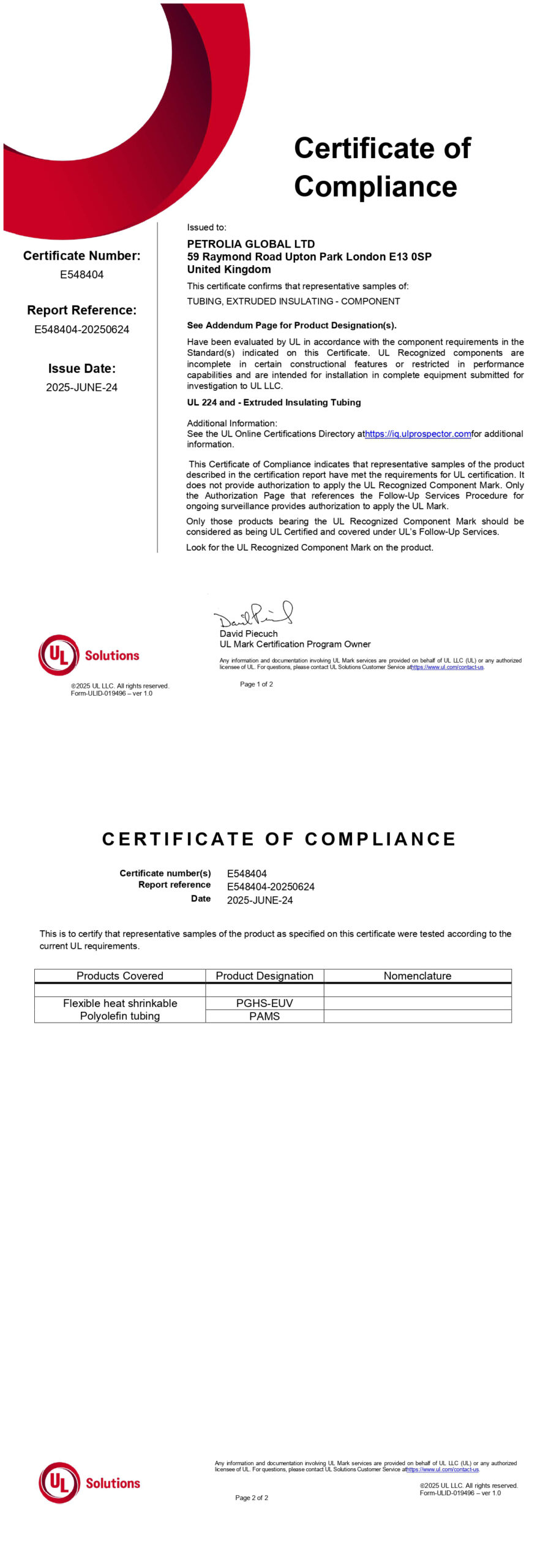 Certificate of Compliance LED UL